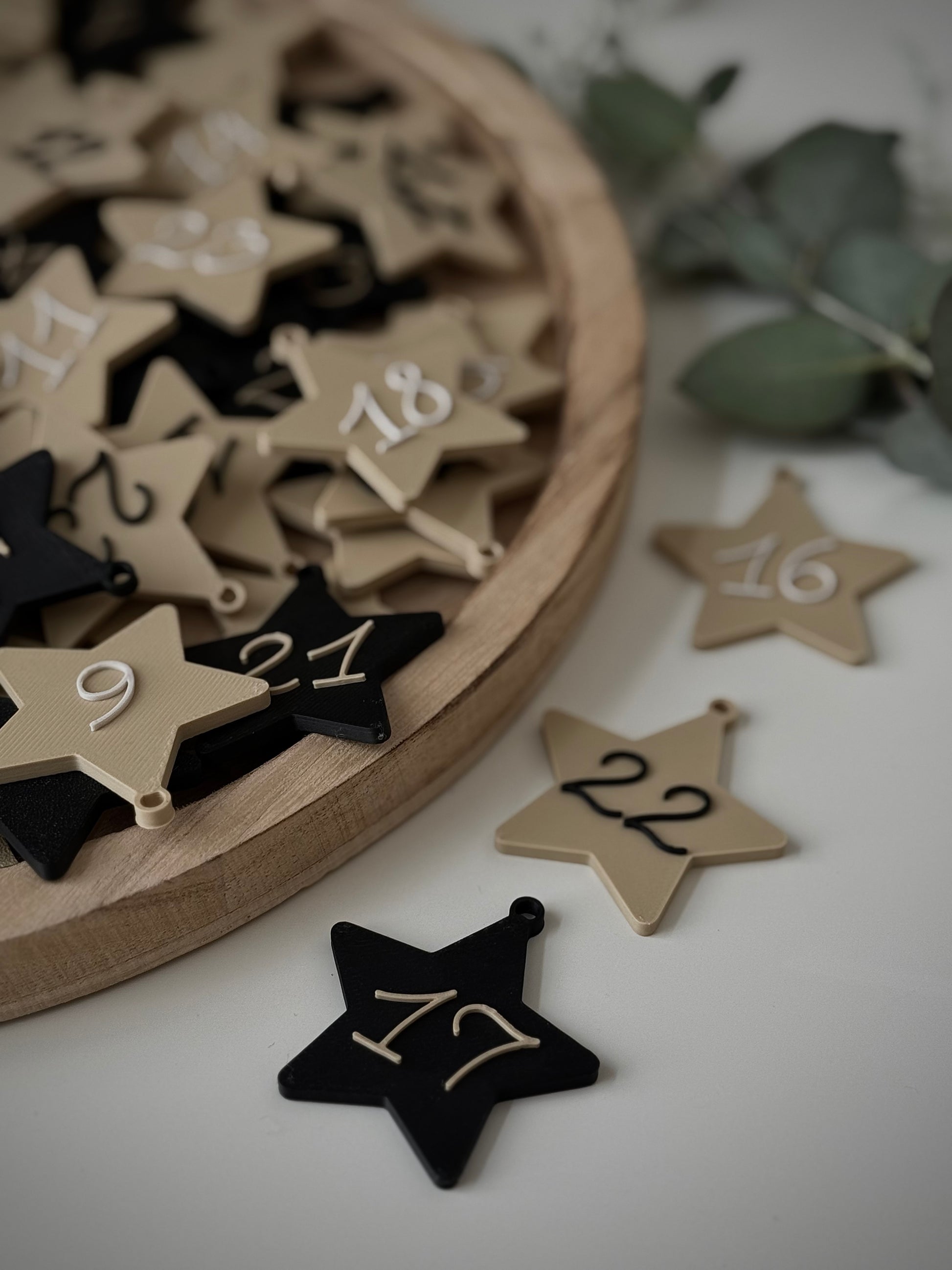 Die sternförmigen Zahlen Chips können jeweils in verschiedenen Farben ausgesucht werden, sowie die Zahlen. Die Farbauswahl findest du in der Bildergalerie.