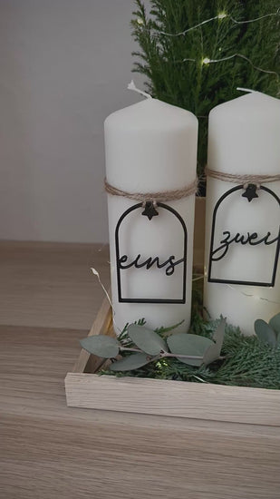 Adventsteller aus Holz mit Kerzen und Adventszahlen Anhänger.